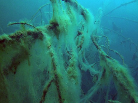Die mit Fadenalgen behangenen Bäume sehen bizarr aus. An den Steilwänden erinnern die Fadenalgen an einen Wasserfall. 18 Störe sollen die Steinbrüche beherbegen. Wir haben ganz genau keinen gesehen. Es kam uns nicht ein Fisch vor die Maske.