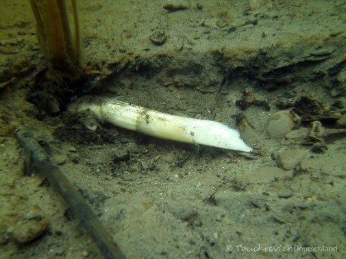 Bei bestem Sonnenwetter sind wir hinabgestiegen zu den Unterwasser-Skulpturen und ausgetaucht entlang der Uferkante. Es war viel Jungfisch im Schutze des Schilfrohrs unterwegs. Die Räuber waren somit auch nicht weit. Freßmulden und abgekaute Pflanzentriebe verrieten die hiesigen Karpfen. Und tatsächlich, der ein oder zeigte sich auch kurzzeitig.