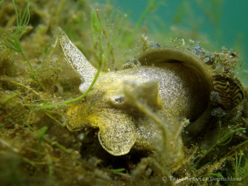 Dort wo die Sonne hinreicht, wachsen zart die ersten Armleuchteralgen. Im Uferbereich kommen Grünalgen und Laichkraut hinzu. Eindeutige Spuren im durchwühlten Schlamm und eine riesige Schuppen – hier müssen Karpfen sein. Und richtig. Zwei große Exemplare fühlten sich durch unser Geblubber gestört. Kleine Schwärme von Weissfischen (ich schätze mal Ukelei) leben gefährlich. Hungrige Hechte lauern gut getarnt. Schöne Exemplare von Spitzschlammschnecken als geduldige Fotomotive.