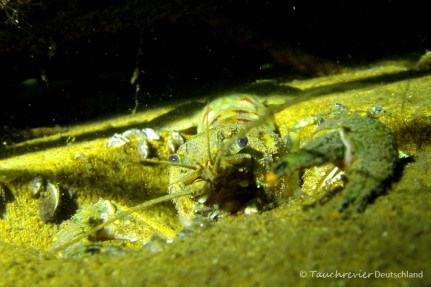 Die Weihnachtsbäume der letzten Weihnachtstauchevents bieten unzähligen Süßwasserpolypenkolonien eine Herberge. Auch Flußrebse heißen diese Verstecke sehr willkommen. Während die Fische noch ihre Winterruhe in den Tiefen der Helene halten, wuseln die kleinen Wesen unaufhaltsam durch das Wasser. Wasserasseln, Wasserflöhe und einige Larven konnte ich beobachten. Insbesondere die kleine gelbgrüne, stabähnliche Larve mit ihren Kiemenauswüchsen am Schwanzende war nett anzuschauen. Nur kenn‘ ich deren Namen noch nicht. Vermutlich die Larve einer Pechlibelle. Vielleicht kann ja jemand helfen.