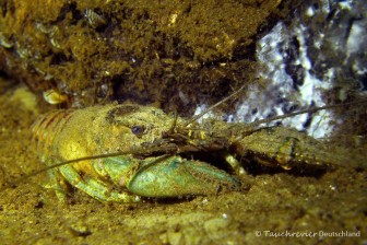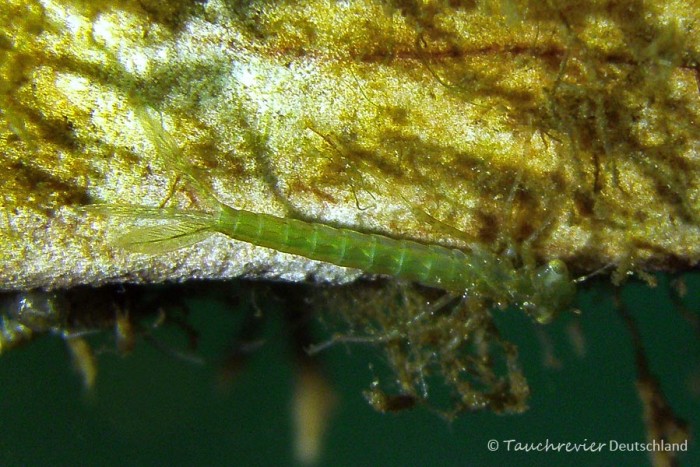 Die Weihnachtsbäume der letzten Weihnachtstauchevents bieten unzähligen Süßwasserpolypenkolonien eine Herberge. Auch Flußrebse heißen diese Verstecke sehr willkommen. Während die Fische noch ihre Winterruhe in den Tiefen der Helene halten, wuseln die kleinen Wesen unaufhaltsam durch das Wasser. Wasserasseln, Wasserflöhe und einige Larven konnte ich beobachten. Insbesondere die kleine gelbgrüne, stabähnliche Larve mit ihren Kiemenauswüchsen am Schwanzende war nett anzuschauen. Nur kenn‘ ich deren Namen noch nicht. Vermutlich die Larve einer Pechlibelle. Vielleicht kann ja jemand helfen.