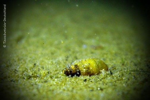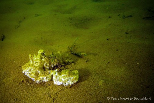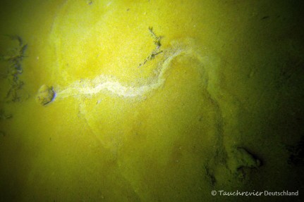 Hinter dem ca. 20m breiten Pflanzen- (vorrangig Brunnenmoos) und Dreikantmuschelgürtel beginnt eine sandige Mondlandschaft. Ich tauche hier sehr gern entlang. Es erinnert mich immer ein wenig an das „muck diving“ in Asien. Und tatsächlich, der Sand lebt. Viele verräterische Spuren von Krebsen, Muscheln und millimetergroßen Blasenschnecken. Laichbänder der Flussbarsche scheinen willkürlich abgelegt. Es gibt jede Menge zu entdecken.