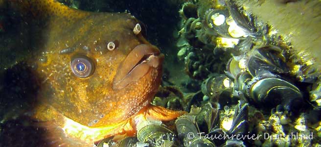 Unsere Autos parken direkt vor dem Ferienhaus „Seehase“. Das war Ansporn genug für den zweiten Tauchgang. Nun kannten wir das Terrain und konzentrierten uns noch mehr auf das Finden von diesen drolligen und eher plumpen Schwimmern. Und da waren sie, am Fuße eines großen Findlings saß ein wunderschönes Seehasen-Pärchen. Sie im zurückhaltenden Grau und er im leuchtenden Orange, beide in Paarungslaune. Die Strömung machte ein Fotografieren nicht unbedingt einfacher. Hier wünschte ich mir eine ebenso zur Saugscheibe umgebildete Bauchflosse wie bei den Seehasen. Drei, vier Fotos und wir ließen die Turteltauben allein. Mit einem breiten Grienen im Gesicht beendeten wir nach einer Stunde auch den zweiten Tauchgang.