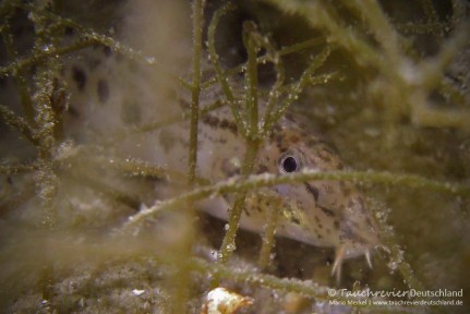 Mit 22 Grad ist das Oberflächenwasser ganz schön warm. Mich zieht es ein wenig tiefer. Sandige Freiflächen umrahmt von verschiedenen Wasserpflanzen deuten auf den Lebensraum der bereits erwähnten Steinbeißer. Einige Spuren im Sand kann ich entdecken. Wenn die kleinen Fische ruhig verharren, sind sie in ihrem Tarnkleid kaum auszumachen. In der Regel bemerken die Dorngrundeln, wie sie auch genannt werden, uns Taucher viel eher und nur ihr „Davonhuschen“ lässt sie uns erkennen. Einmal ausgemacht, versuche ich mich den Tieren mit meiner Sealife zu nähern. Es beginnt ein Katz-und-Maus-Spiel. Meist bin ich der Verlierer.