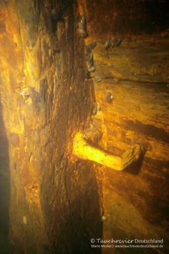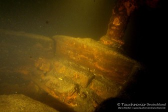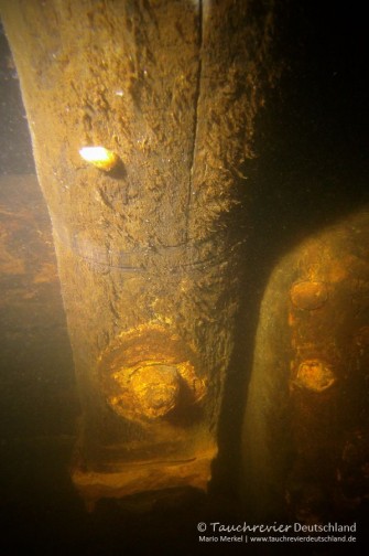 Wir plaudern und vergessen beinah dabei ins Wasser zu steigen. Schwer bepackt lassen wir uns schliesslich in das herrliche Wasser fallen. Es ist immer wieder eine Wohltat. Check und wir tauchen ab. Unter Wasser alles zurecht gerüttelt, Bubbelcheck und wir fliegen in Richtung Kaffenkahnwrack. Wir gleiten entspannt hinab und erreichen nach etwa 7min das Bug des Wracks. Es liegt noch da. Kaulbarsche ruhen am Grund. Es sind wirklich schöne Tiere. Die Sicht ist nicht besonders. Aber das wird sicherlich noch werden. Wir lassen uns Zeit, das tieferliegende Heck des Kahns mit dem mächtigen Ruder zu erreichen, vorbei an der eingefallenen Kajüte mit einem Blick ins Innere. Nein, der große Waller treibt noch sein Unwesen im See.
