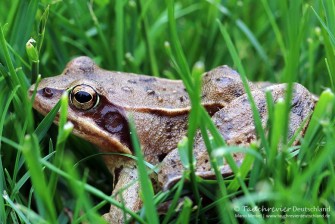 Seine Haut ist im Gegensatz zum Teich- oder Laubfrosch in verschiedenen Brauntönen gefärbt, ein „Braunfrosch“ eben. Ein markantes Merkmal dieser Lurche sind die deutlich dunkel abgesetzten Schläfenflecken. Daran ist unser heimischer Frosch gut zu erkennen. Ebenso ein gutes Bestimmungsmerkmal der Art sind die gestreiften Hinterbeine. Die schwarzen, länglich-ovalen Pupillen des Grasfrosches sind eingefasst von einer wunderschönen, goldenen Iris. Diese tollen Augen finde ich immer wieder faszinierend.
