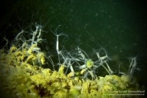 Sehr viele Amerikanische Kamberkrebse sind im See unterwegs. Fressend, dösend oder einen Partner suchend. Auffällig diesmal auch die großen Kolonien von Süßwasserpolypen vorrangig an den Enden des Rauen Hornblattes. Im Sommer scheinen sich die kleinen Nesseltiere eher zurückzuziehen. Ich schaue im Revier der Steinbeißer vorbei. Stille. Nicht eine dieser wunderschönen Grundeln bekomme ich vor die Maske.