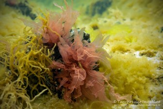 Die Sicht ist erwartungsgemäß toll. Der Frühling taucht die Unterwasser-Flora in ein Farbenmeer. Algen, Seegräser leuchten in allen Rot- und Grüntönen. Es sieht wunderschön aus. Dazwischen huschen bunte Fische und Garnelen, zu schnell für meine Kamera. Medusen lassen sich von der seichten Strömung treiben. Es gibt so viel zu entdecken und zu schauen. Nach gut 30 min erscheinen die ersten kleinen Formationen, die zu einer interessanten Schluchtenwelt auswachsen. Die See ist hier etwa 4-6 m tief. Unsere Aufmerksamkeit gilt den Findlingen, typischen Seehasenplätzen. Doch allein die Seehasen bleiben unentdeckt. Viele Buttfische, Flundern, sind hier anzutreffen. Seltsame Erscheinungen. Kommen Sie symmetrisch zur Welt, entwickeln sie sich aber bald zu den markanten asymmetrischen Plattfischen. Nach einer guten Stunde kehren wir um und steigen nach 90 min aus dem Wasser.