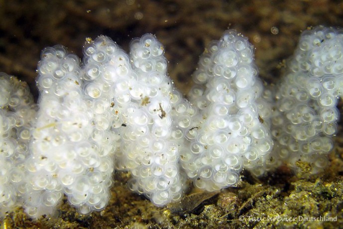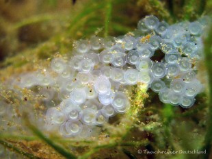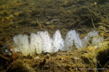 Im Frühjahr (April/Mai) sind die sehr auffälligen Laichstränge der Flussbarsche zu entdecken. Kaum zu glauben, dass die Fische derartige Netzmuster bei der Eiablage erzeugen können. Ihr habt sicher solche Laichbänder bei Euren Tauchgängen beobachten können.