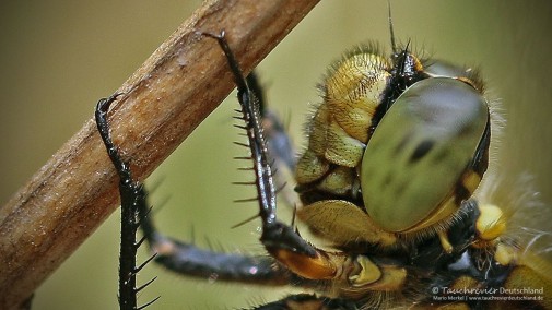Libellen tragen an ihrem extrem beweglichen Kopf zwei Facettenaugen als Seeorgane. Als Fotograf mache ich die Erfahrung, dass sie damit verdammt gut sehen können. Sowohl im Flug als auch als Lauerjäger von einem exponierten Standort halten sie mit diesen großen Augen Ausschau nach Beute, steigen auf, schlagen zu und verspeisen den Fang. Mit bis zu 50 km/h sollen die agilen Jäger unterwegs sein.