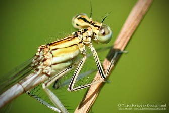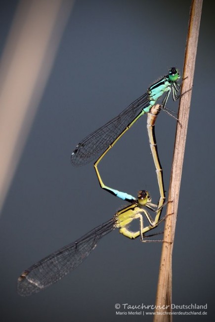 Gemeinsam oder im Schutz des Männchens heftet später das Weibchen mit seinem langen Schwanz die Eier an Wasserpflanzen unterhalb der Wasseroberfläche oder lässt die Eier einfach ins Nass fallen. Es entwickeln sich Larven, die als gefürchtete Räuber für einen längeren Zeitraum im Wasser leben. Als Taucher habt ihr bestimmt schon Libellenlarven beobachten können.