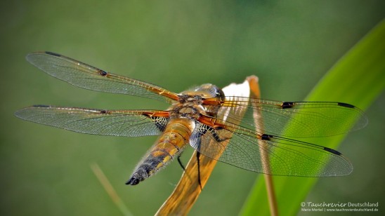 Auf meinen Erkundungen im Tauchrevier konnte ich schon viele dieser wundervollen Tiere beobachten. Ihr perfekter Körperbau und die Farbvielfalt faszinieren mich. In diesem Jahr habe ich feuerrote Exemplare der Großlibellen am Wasser entdeckt, Einwanderer aus dem südlichen Raum. Jedes Körperteil dieser Feuerlibelle ist wahrlich feuerrot. Wunderschön.