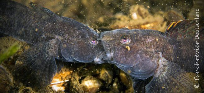 Mehrere Tauchgänge im naheliegenden Kalksee sind in meinem Logbuch vermerkt. Im letzten Jahr jedoch bemerkte ich kleine am Boden huschende Wesen. Je mehr sich meine Augen auf die winzigen Tiere fokussierten, je zahlreicher erschienen sie. Ich hatte noch keine Ahnung, um welche Art es sich bei diesen offensichtlichen Fischen handelt. Einen, zwei, maximal drei Zentimeter maßen ihre Körper. Die Tiere lagen zwischen den Trieben des Gemeinen Brunnenmoos und „hüpften“ von Muschel zu Muschel einer großen Zebramuschelkolonie. Bei der geringsten Gefahr verschwanden sie blitzschnell in den zahllosen Versteckmöglichkeiten. Vorsichtig banne ich sie auf den Chip meiner Unterwasserkamera.