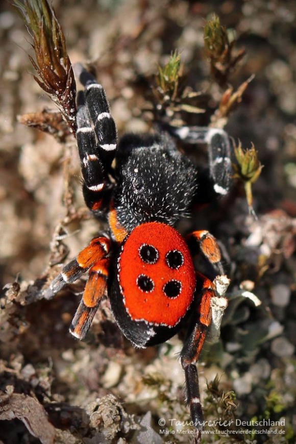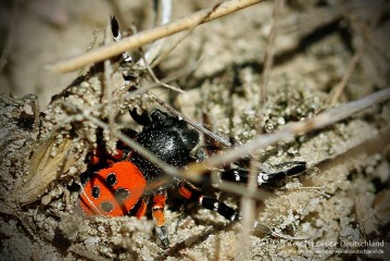 Allein im August/September kann man die umherziehenden Männchen auf der Suche nach einem größeren, schwarzen Weibchen beobachten. Die übrige Zeit verbringen sie lauernd in ihren Röhren. Das Rote Kleid erinnert stark an einen ungeniessbaren Marienkäfer und soll so die Fressfeinde abschrecken. Ist ein Weibchen ausgemacht, zieht das Männchen zu ihr in die Röhre und es kommt zu Paarung. Danach stirbt es. Das Weibchen legt die Eier und füttert die geschlüpften Jungtiere aufopferungsvoll mit Nahrungsbrei bis es stirbt.