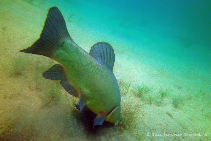 - Schleie, mit ihren Brustflossen abstützend, beim Wühlen