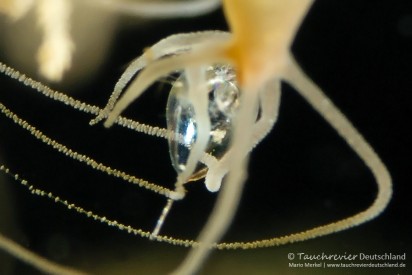 Sie haften fest an Stein und Holz, aber auch auf Muscheln, Krebsen und Wasserpflanzen wie Hornblatt, Brunnenmoos und Tausendblatt siedeln sie gern. Mit ihren Nesseltentakeln überwältigen sie alles, was in Reichweite dieser kommen. Die Nesselkapseln sind im übrigen „Einwegwaffen“, also nicht regenierbar. Alles tierische Plankton (Zooplankton) steht auf dem Speisezettel. Wasserflöhe und Flohkrebse werden mit den langen Tentakeln „umarmt“, betäubt und zur Mundöffnung am Stamm des Polypen geführt.