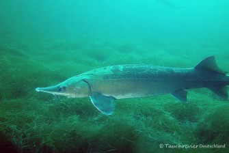 War ich früher immer geneigt, den Kessel zu umrunden, so tauche ich jetzt sehr gern quer durch den Kessel. Der mit Sedimenten angereicherte Boden ist der Freßplatz eingesetzter Störe. Und auch diesmal wurden wir nicht enttäuscht. „Staubwolken“ verrieten schon von der Ferne die Anwesenheit dieser Urtiere. An Taucher gewöhnt, liessen sie sich auch nicht sonderlich stören, ein Stör halt :-). Wenn man sich ruhig verhält, dann nähern sich die Tiere von ganz allein. Unter diesen tollen Bedingungen mit den wundervollen Tieren zu tauchen, ist ein Privileg.