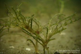 Ein breiter Pflanzengürtel begrüßt mich. Inmitten dieses Grüns ein Hecht, die vorbeihuschenden Plötzen fest im Blick. Dabei stellt man sich schon mal kopfüber ins Wasser. Wir scheinen Schleie zu stören. Mit kräftigen Flossenschlägen verschwinden sie. Hochwachsendes Laichkraut und Tausendblatt. Schöne Leuchteralgen, verschiedene Arten, ob Arm- (Chara), Glanz- (Nitella) oder Baum- (Tolypella) Leuchteralgen vermag ich nicht mit Gewissheit sagen, auf jeden Fall vielfältig. Kleines Nixkraut, Krauses Laichkraut. Das Uferbereich ist ordentlich bewachsen. Aber etwas stört. Das Grün leuchtet nicht. Die orangeroten „Knospen“ der Hornblättrigen Armleuchteralge sind schwer auszumachen. Die Makrophyten sind stark sedimentiert, werden teilweise erdrückt von der Last.