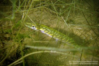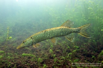 Kurz vor dem Ausstieg treffe ich noch auf einen jungen Hecht, der den vorbei huschenden Plötzen und Rotfedern auflauert. Hab‘ ihm wohl seine einmalige Gelegenheit versaut. Nach knapp 2 Stunden tauche ich auf. Dunkle Gewitterwolken beherrschen bereits den Himmel. Biltze zucken am Horizont. In Rekordgeschwindigkeit bin ich aus meinen Tauchklamotten und sitze im trockenen Auto bevor es sich sintflutartig ergießt.
