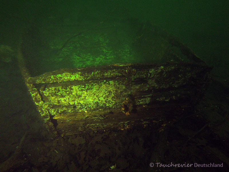 Von der zweiten Badeplattform führt eine Leine, der ich in Richtung Seemitte folge. Es dauert nicht lange und eine Plattform zeigt sich mir. Hier finden also sicherlich Ausbildungs-Freiwassertauchgänge statt. Von der Plattform eine zweite Leine. Irgendwie kann ich mich der Leinenführung nicht entziehen und folge. Ein hölzerner Ruderkahn ist am anderen Ende festgemacht. Nicht spektakulär, aber eine willkommene Abwechslung. Eine weitere Leine führt nach meinem Kompass Richtung Ufer. Dieser folge ich nicht. Ich tauche abwärts. Ab 6-7m klart es ein wenig auf und das Wasser kühlt sich merklich ab. Viele Schwebeteile, die sich im Schein meiner Lampe als Zooplankton herausstellen. Alles lebt. Keine Pflanzen mehr. Sandiger Boden bedeckt von Bakterienteppichen. Die bessere Sicht hält nicht lange an. Ab 8m Tiefe ein undurchdringlicher Braunschleier. Ein paar Flossenschläge, es wird nicht besser. Ich kehre um und möchte mich ein wenig im Pflanzengürtel umsehen.