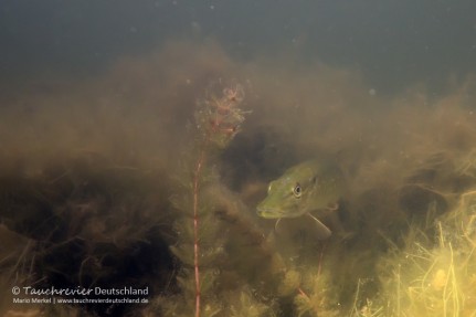 Kurz vor dem Ausstieg treffe ich noch auf einen jungen Hecht, der den vorbei huschenden Plötzen und Rotfedern auflauert. Hab‘ ihm wohl seine einmalige Gelegenheit versaut. Nach knapp 2 Stunden tauche ich auf. Dunkle Gewitterwolken beherrschen bereits den Himmel. Biltze zucken am Horizont. In Rekordgeschwindigkeit bin ich aus meinen Tauchklamotten und sitze im trockenen Auto bevor es sich sintflutartig ergießt.