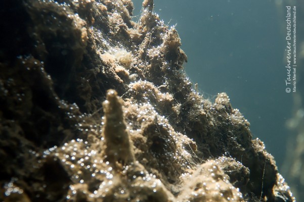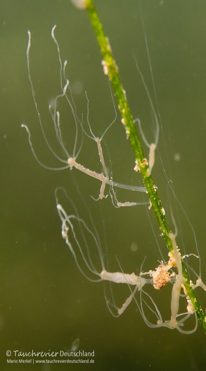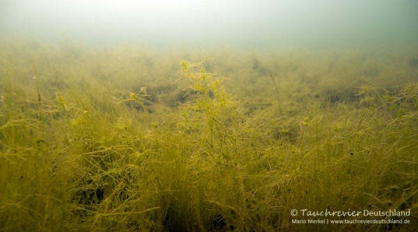 Während die Karpfen im Bereich 2-3 m keinen Halm wachsen lassen, konnten wir abseits ihrer Freßplätze verschiedene Laichkräuter, Tausendblatt, Raues Hornblatt und einzelne Armleuchteralgen entdecken. Süßwasserpolypen bevölkern das Blattwerk des Laichkrautes.
