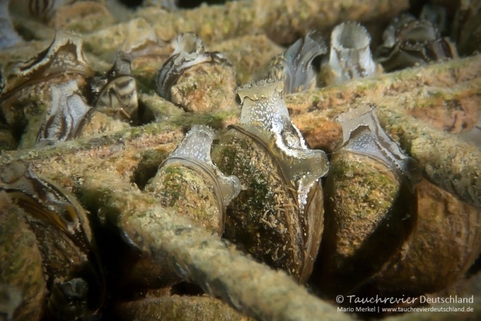 Kopulierende Kamberkrebse, Ohrschlammschnecken, Polypen, doch keine weiteren Fische. Der Kulkwitzer See soll fischreich sein, sogar große Waller sind häufig anzutreffen. Sicher nur alles eine Frage der Zeit. Ich tauche in die Mitte der Südbucht und erreiche gut 10-12m Tiefe. Auf 8 m treffe ich dann auf eine mit Dreikantmuscheln besetzte Übungsplattform der Tauchschule. Nach 100 min und einem entspannten Tauchgang tauche ich auf und mache mich auf den Weg zum Auto. Unterwegs treffe ich eine junge Frau mit Hund, die dem tropfenden, schwarzen Mann ein „Du siehst ja gut aus.“ entgegenruft. Das konnte ich nur erwidern.