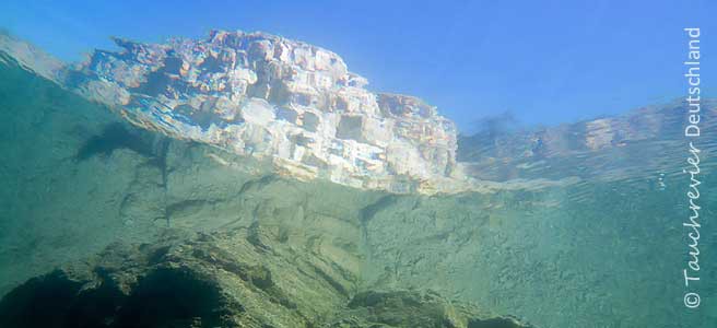 Nun haben wir für die Umrundung des überschaubaren Steinbruches doch gute 90 Minuten benötigt. Es gibt so viel zu entdecken. Und dass Tauchen im sonnengefluteten, klaren Wasser ist einfach überwältigend. Mit einer Bulette in der Hand schauen wir noch einmal hinab in das kleine Tauchparadies. Tauchen im Tauchrevier Sachsen-Anhalt.