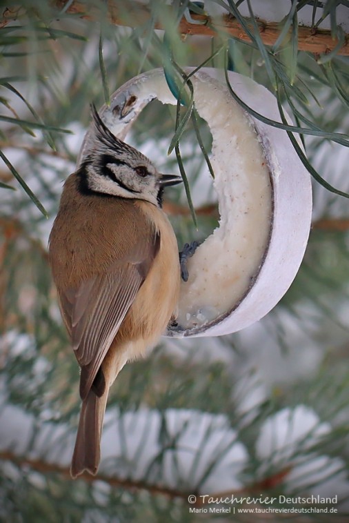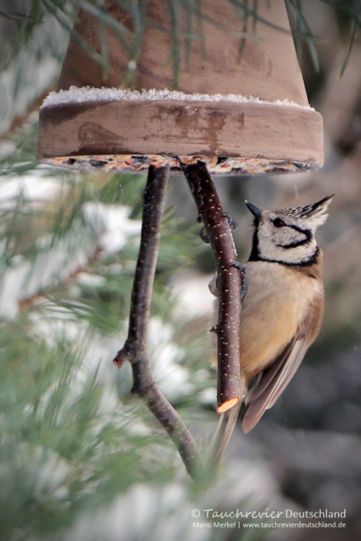 Nach einer guten halben Stunde zeigen sich die ersten Meisen. Das Klicken der Kamera lässt sie noch kurz aufscheuchen, doch nach weiteren 30 min haben sie sich ein wenig daran gewöhnt. Blaumeise, Kohlmeise, Haubenmeise, Spechtmeise laben sich an der Meisensuppe. Beim Betrachten der Bilder staune ich immer wieder, wie wunderhübsch gezeichnet die kleinen Vögel sind.