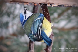 Nach einer guten halben Stunde zeigen sich die ersten Meisen. Das Klicken der Kamera lässt sie noch kurz aufscheuchen, doch nach weiteren 30 min haben sie sich ein wenig daran gewöhnt. Blaumeise, Kohlmeise, Haubenmeise, Spechtmeise laben sich an der Meisensuppe. Beim Betrachten der Bilder staune ich immer wieder, wie wunderhübsch gezeichnet die kleinen Vögel sind.